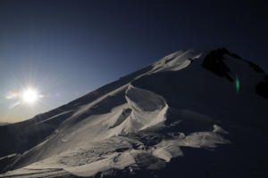 über den geschwungenen Bosses Grat, um bei Sonnenaufgang am Gipfel des Mont Blancs zu stehen. Noch am selben Tag